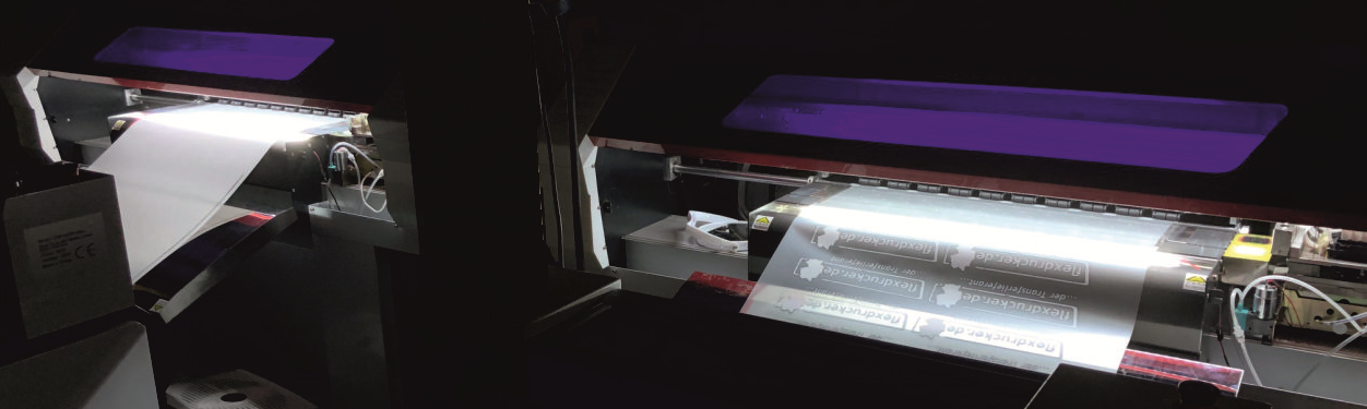 Unsere DTF-Druckmaschinen bringen die Farben (CMYK+weiß) mit dem sogenannten Tintenstrahldruckverfahren auf eine speziell beschichtete Transferfolie auf. Die weiße Farbe wird unmittelbar danach fast zeitgleich aufgetragen. Anschließend wird der noch nasse Farbauftrag mit einer Schicht aus Thermopulver überzogen. Im letzten Schritt wird das Motiv erhitzt und damit fixiert und haltbar gemacht. Unsere Kunden übertragen dann ihr Motiv mit einer Thermotransferpresse auf Ihre Textilien.